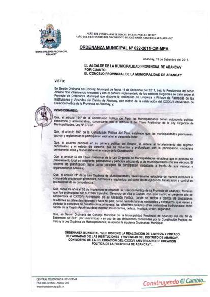 Que, todos los años el 03 de noviembre se recuerda la Creación Política de la Provincia de Abancay, fechaen que fue promulgada por el poder ejecutivo elevando de villa a Ciudad, con este motivo el presente año se conmemora el CXXXVII Aniversario de su Creación Política, donde se recibea cientos de ciudadanos residentes en diferentes regiones y fuera del pais, como tambien turistas nacionales y extranjeros, que vienen a disfrutar la exquisitez de nuestro clima primaveral, los diferentes potajes y otras costumbres tradicionales, como capital de la Región Apurímac, debe mostrar los encantos, belleza, limpieza , order y seguridad.