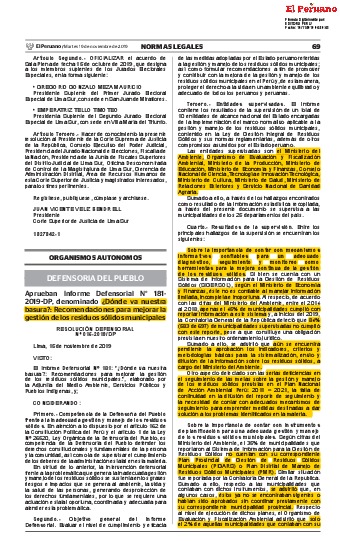 herramientas para la mejora continua de la gestión de los residuos sólidos. Si bien se cuenta con un Sistema de Información para la Gestión de Residuos Sólidos (SIGERSOL), según el Ministerio de Economía y Finanzas, éste no es confiable al manejar información limitada, incompleta e inoportuna. Al respecto, de acuerdo con las cifras del Ministerio del Ambiente, entre el 2014 al 2018, apenas el 45% de municipalidades cumplió con reportar información a este sistema y, a inicios del 2019, la Contraloría General de la República detectó que 84% (583 de 697) de municipalidades supervisadas no cumplió con este reporte, pese a que constituye una obligación prevista en nuestro ordenamiento jurídico