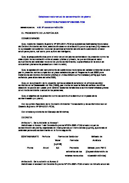 El presente decrto supremo establece el valor anual de la concentracion de plomo.