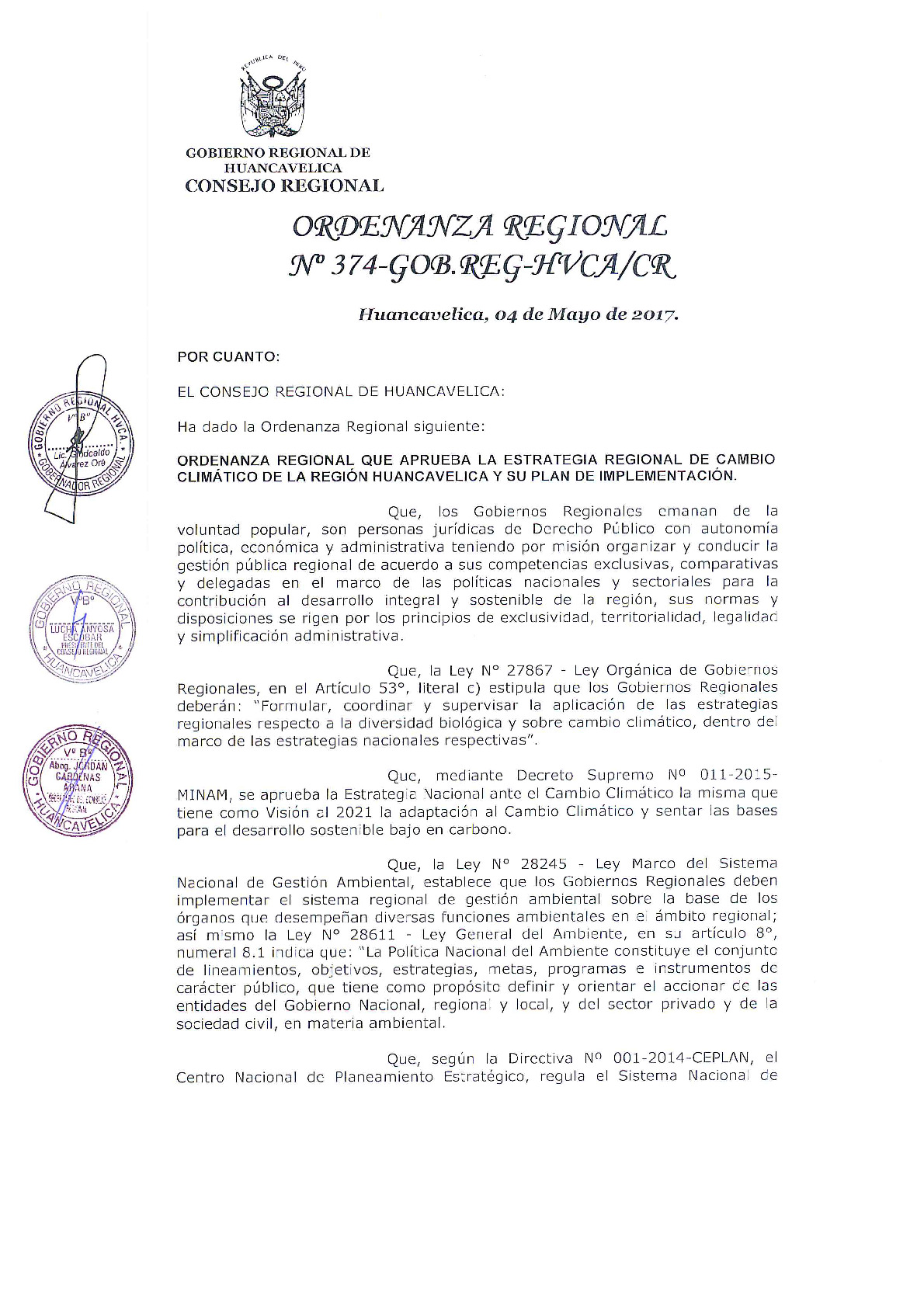 OR N° 374-2017, QUE APRUEBA LA ESTRATEGIA REGIONAL DE CAMBIO CLIMÁTICO DE HUANCAVELICA Y SU PLAN DE IMPLEMENTACIÓN