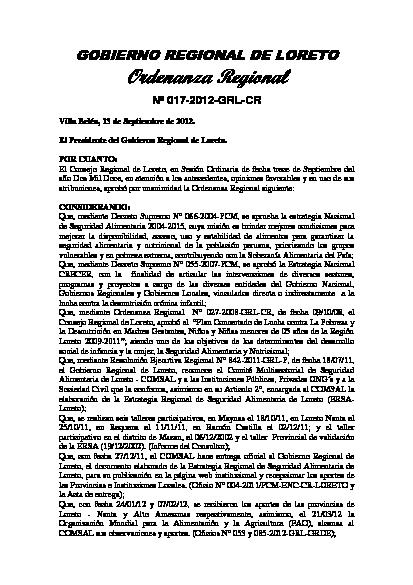 APROBAR, la “ESTRATEGIA REGIONAL DE SEGURIDAD ALIMENTARIA Y NUTRICIONAL DE LA REGIÓN LORETO (ERSAN) - 2012-2022”, que como Anexo en ochenta y uno (81) folios visados al margen, forma parte integrante de la presente Ordenanza Regional.