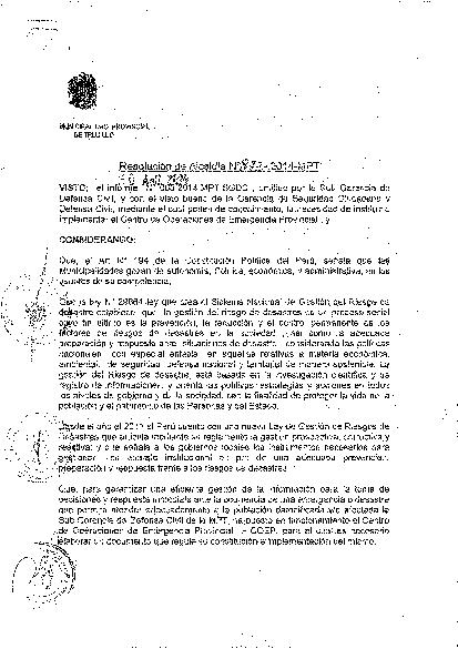 Mediante esta Resolución de Alcaldía se instituye e implementa el Centro de Operaciones de Emergencia Provincial con la finalidad de monitorear los peligros, emergencias y desastres, así como en la administración e intercambio de la información, para la oportuna toma de decisiones de las autoridades del Sistema, en el ámbito provincial.