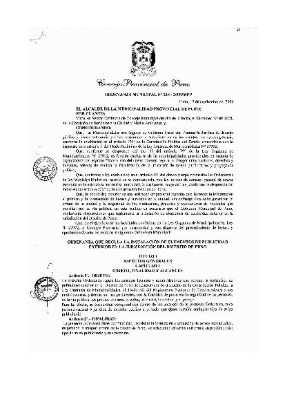 Regula los aspectos tecnicos y administrativos que norman la instalacion de publicidad exterior en el Distrito de Puno deacuerdo con lo dispuesto en la Constitucion Politica,la Ley Organica de Municipalidades.Su finalidad es reordenar la instalacion y ubicacion de avisos publicitarios respetando la imagen urbana d ela Ciudad de Puno.
