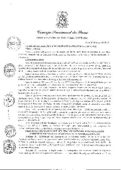 Artiulo 2º:Gestionar su implementacion participativa de los instrumentos de Gestión Ambiental aprobados por la presente Ordenanza por parte de la Municipalidad Provincial de Puno.