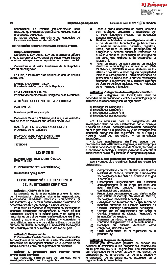 La presente ley tiene por objeto promover la labor del investigador científico altamente especializado, seleccionado mediante procesos competitivos y transparentes, que permita contar con una plataforma de desarrollo científico y tecnológico a favor del país. Para tal fin se reconoce la trayectoria del investigador científico, destacando principalmente el mérito de sus actividades científicas o tecnológicas, y se establece mecanismos para atraer y retener al investigador científico, nacional y extranjero; para fortalecer y consolidar la competitividad nacional y para dotar al Estado de capital humano en ciencia, tecnología e innovación tecnológica que contribuya con el desarrollo sostenible del país.