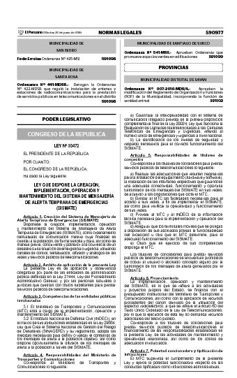 Mediante esta Ley se dispone la creación, implementación, operación y mantenimiento del Sistema de Mensajería de Alerta Temprana de Emergencias (SISMATE), como ordenamiento centralizado de comunicación masiva cuya finalidad es orientar a la población, de forma sencilla y clara, así como de manera previa, concurrente y posterior a la ocurrencia de un desastre o una situación de emergencia o urgencia, utilizando canales de control, señalización, difusión y análogos de las redes y servicios públicos de telecomunicaciones.