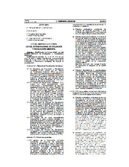 Mediante esta ley se modifican los artículos 10, 11, 13, 15,17 y 19; así como la sexta y sétima disposiciones complementarias finales de la Ley 29325, Ley del Sistema Nacional de Evaluación y Fiscalización Ambiental.