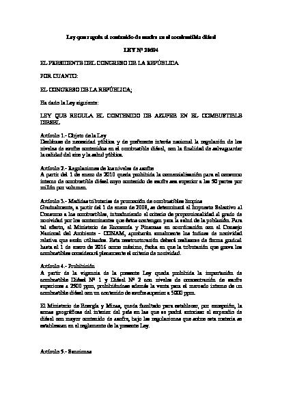 El objeto de la presente Ley es declarar de necesidad pública y de preferente interés nacional la regulación de los niveles de azufre contenidos en el combustible diésel, con la finalidad de salvaguardar la calidad del aire y la salud pública. A partir del 1 de enero de 2010 queda prohibida la comercialización para el consumo interno de combustible diésel cuyo contenido de azufre sea superior a las 50 partes por millón por volumen.