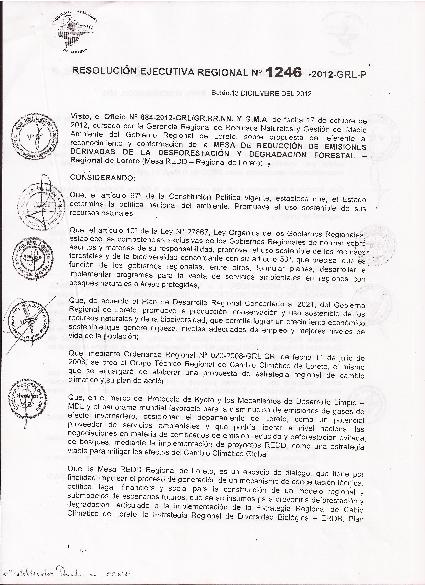 La presente RESOLUCION EJECUTIVA REGIONAL N° 1246-2012-GRL-P; resuelve reconocer a la MESA DE REDUCCION DE EMISIONES DERIVADAS DE LA DEFORESTACION Y DEGRADACION FORESTAL - Regional de Loreto (Mesa REDD - Regional de Loreto) con un espacio de interes y generacion de mecanismos de consertacion técnica, política, financiera y social cuya finalidad es contribuir a un modelo regional que sera insumo para prevenir la deforestación y degradación de nuestros bosques.