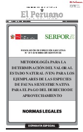 La presente norma aprueba la “Metodología para la determinación del Valor al Estado Natural (VEN) para los ejemplares de las especies de fauna silvestre nativa para el pago del derecho de aprovechamiento”. Asimimso dispone, que en caso se requiera el valor del VEN para un ejemplar de una especie de fauna silvestre nativa, que no se encuentre en la lista aprobada en el artículo 2 de la presente resolución, se debe utilizar el VEN de una de las especies de similar característica, ya sea en género, familia, orden o categoría, que se encuentre en dicha lista, y que corresponda a la misma modalidad de aprovechamiento para la cual será utilizada.