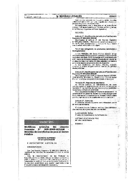 El presente decreto supremo modifica los articulos 4º y 6º del Supremo Nº 009-2009-MINAM Medidas de EcoefiCtencia para el Sector Público, referidos a: