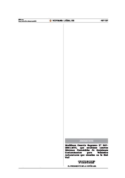 Modifíquese los artículos 2°, 4°, 5°, 6°, 7º , 9° y 10°, así como los Anexos Nº 1, Nº 2, Nº 3 y Nº 4 del Decreto Supremo Nº 047-2001-MTC y sus modificatorias. Precísese que los Límites Máximos Permisibles (LMPs) de Emisiones Contaminantes para vehículos automotores en circulación, vehículos automotores nuevos a ser importados o ensamblados en el país, y vehículos automotores usados a ser importados, a que se refiere el Reglamento Nacional de Vehículos, aprobado por Decreto Supremo Nº 058-2003-MTC y sus modificatorias, son los establecidos en el presente Decreto Supremo.