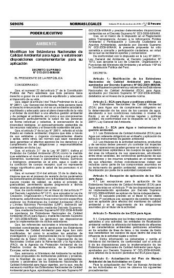 Por medio de la presente se hace de conocimiento público la modificación de los Estándares Nacionales de Calidad Ambiental para Agua, aprobados por Decreto Supremo Nº 002-2008-MINAM. Modifíquese los parámetros y valores de los Estándares Nacionales de Calidad Ambiental (ECA) para Agua, aprobados por Decreto Supremo Nº 002-2008-MINAM, detallados en el Anexo de la presente norma.