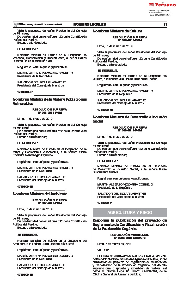 Resolución nombra a Ministra de Estado en el Despacho del Ambiente, a la señora Lucía Delfina Ruíz Ostoic.