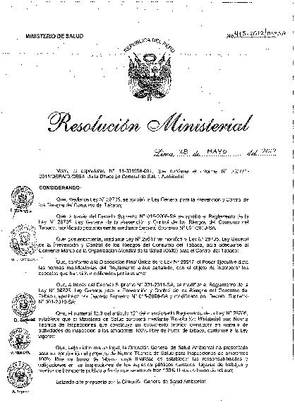 Norma Técnica de Salud para Inspecciones de ambientes 100% libre de humo de tabaco, que en documento adjunto forma parte integrante de la presente resolución. El objetivo de la norma técnica es establecer el procedimiento para la realización de las inspecciones en cumplimiento del marco normativo vigente, para la verificación de ambientes libres de humo de tabaco.