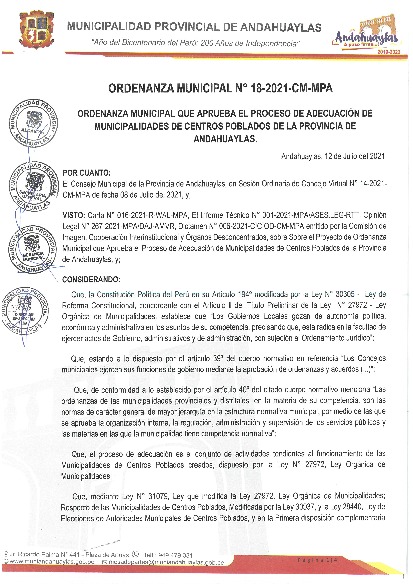 EL Objetivo de la presente ordenanza es regular el proceso de la adecuación de las Municipalidades de Centros Poblados de la Provincia de Andahuaylas, Dispuesto en la Ley que modifica la Ley Nº 27972, Ley Orgánica de Municipalidades, Respecto a las municipalidades de Centros Poblados modificado por la Ley 30937, y la Ley 28440, Ley de Elecciones de Autoridades Municipalidades de Centro Poblados; Ley Nº 31079.