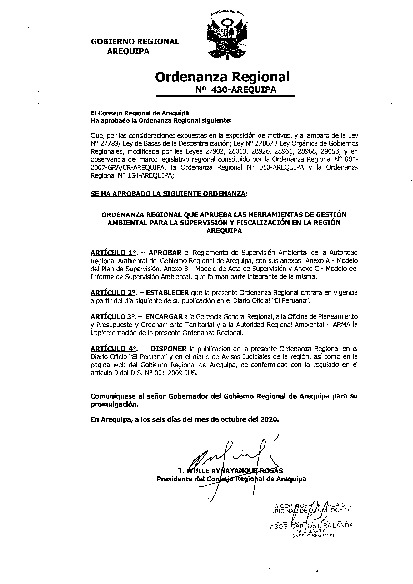 Mediante la O.R. 430 Arequipa, se aprueba el REGLAMENTO DE SUPERVISIÓN AMBIENTAL de la Autoridad Regional Ambiental, medida que fortalece el proceso de FISCALIZACIÓN AMBIENTAL a nivel regional.