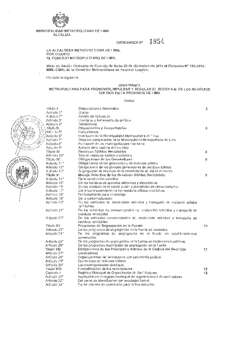 Ordenanza Metropolitana para promover, impulsar y regular el reciclaje de los residuos sólidos en la Provincia de Lima