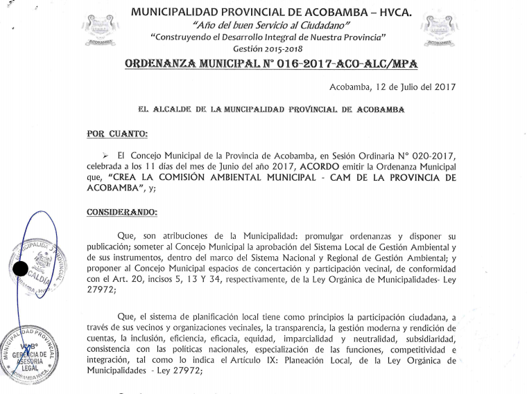 Ordenanza Municipal N° 016-2017-ACO-ALC/MPA.- ORDENANZA MUNICIPAL QUE CREA LA COMISIÓN AMBIENTAL MUNICIPAL- CAM DE LA PROVINCIA DE ACOBAMBA