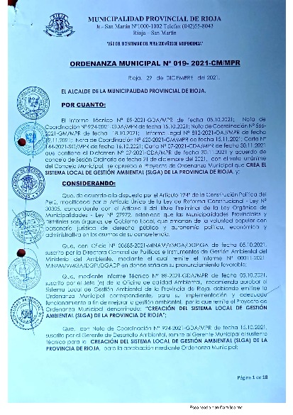 Ordenanza Municipal N° 019 - 2021 - CM/MPR