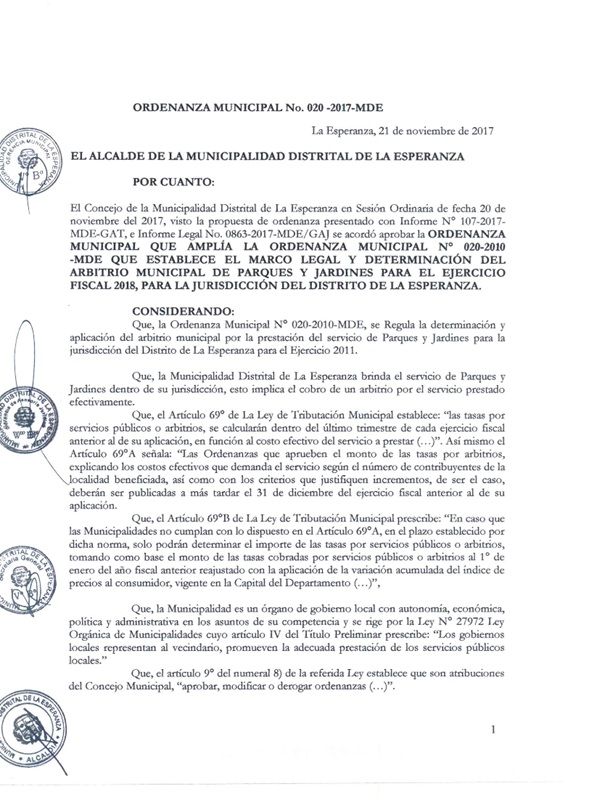 Ampliar la Ordenanza Municipal Nº 020-2010-MDE que regula la determinación y aplicación del arbitrio municipal por la prestación del servicio de parques y jardines, para la jurisdicción del distrito de La Esperanza, para el ejercicio fiscal 2018.