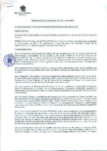 Ordenanza Municipal que Aprueba la Modificación al Reglamento de Desarrollo Urbano de la Provincia de Trujillo