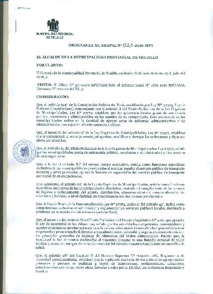 Ordenanza Municipal que aprueba la Modificaciòn del Reglamento de Organizaciòn y Funciones (ROF) de la Ordenanza Municipal Nª 028-2012-MPT de la Municipalidad Provincial de Trujillo incorporando la función de vigilancia sanitaria de la inocuidad agrolimentaria de alimentos primarios y piensos, en el transporte y comercialización a la Subgerencia de Salud.