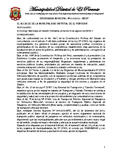 Ordenanza Municipal que aprueba el reglamento del servicio de transporte público especial de pasajeros en vehículos menores dentro de la jurisdicción del distrito de El Porvenir