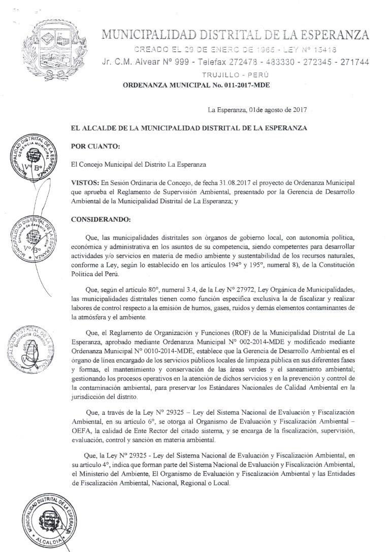 Ordenanza Municipal que aprueba el reglamento de supervisión ambiental de la municipalidad distrital de La Esperanza