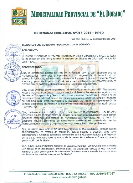 Ordenanza Municipal que crea el Sistema de Informacion Ambiental - SIAL, para la Provincia de El Dorado