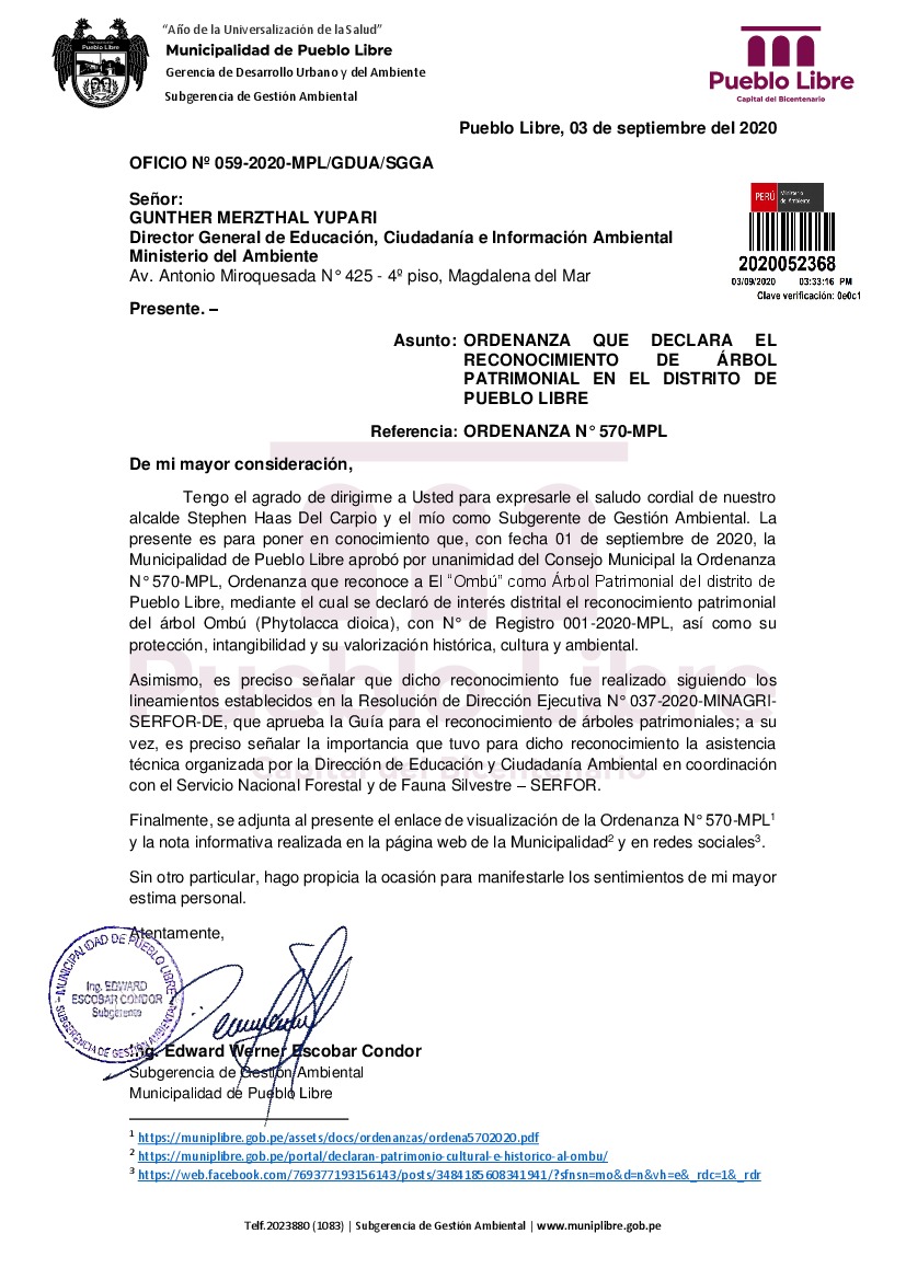 Ordenanza Municipal que declara el reconocimiento del árbol Patrimonial de Ombú, ubicado en el distrito de PuebloLibre