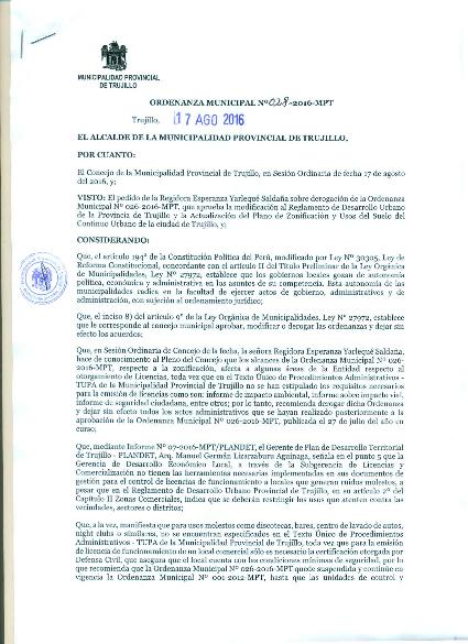 Ordenanza que deroga la Ordenanza Municipal N° 026-2016-MPT, publicada con fecha 27 de julio del año en curso, que aprueba la modificación al Reglamento de Desarrollo Urbano de la Provincia de Trujillo y la Actualización del Plano de Zonificación y Usos del Suelo del Continuo Urbano de la ciudad de Trujillo.