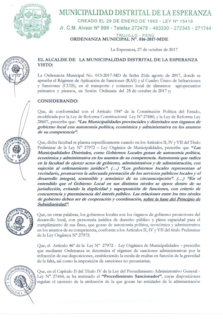 Deroga la Ordenanza Municipal Nº 013-2017-MDE, y toda disposición que se oponga a lo dispuesto en la presente Ordenanza, incorporar en el Régimen de Aplicación de Sanciones - RAS y el Cuadro Único de Infracciones y Sanciones - CUIS aprobado mediante la Ordenanza Municipal Nº 014-2009-MDE, la Ordenanza Municipal Nº 028-2009-MDE, la Ordenanza Municipal Nº 002-2012-MDE, la Ordenanza Municipal Nº 013-2012-MDE, y la Ordenanza Municipal Nº 005-2014-MDE, que regulan el Reglamento de Aplicación de Sanciones Administrativas - REASA, y el cuadro de infracciones y sanciones - CISA de la Municipalidad Distrital de La Esperanza, la tipificación de infracciones y sanciones a personas naturales y jurídicas proveedoras del transporte y comercio de alimentos agropecuarios, primarios y piensos conforme en ANEXO Nº 1 que forma parte integrante de la presente Ordenanza.