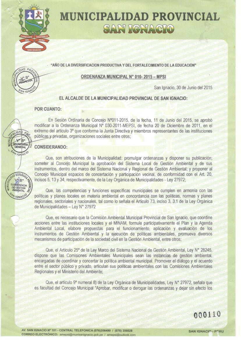 Ordenanza que modifica erl articulo 3° de la ordenanza Municipal Nº 030-2011-MPSI en el extremo de la Junta Directiva de la Comisión Ambiental Municipal Provincial 2015-2018.