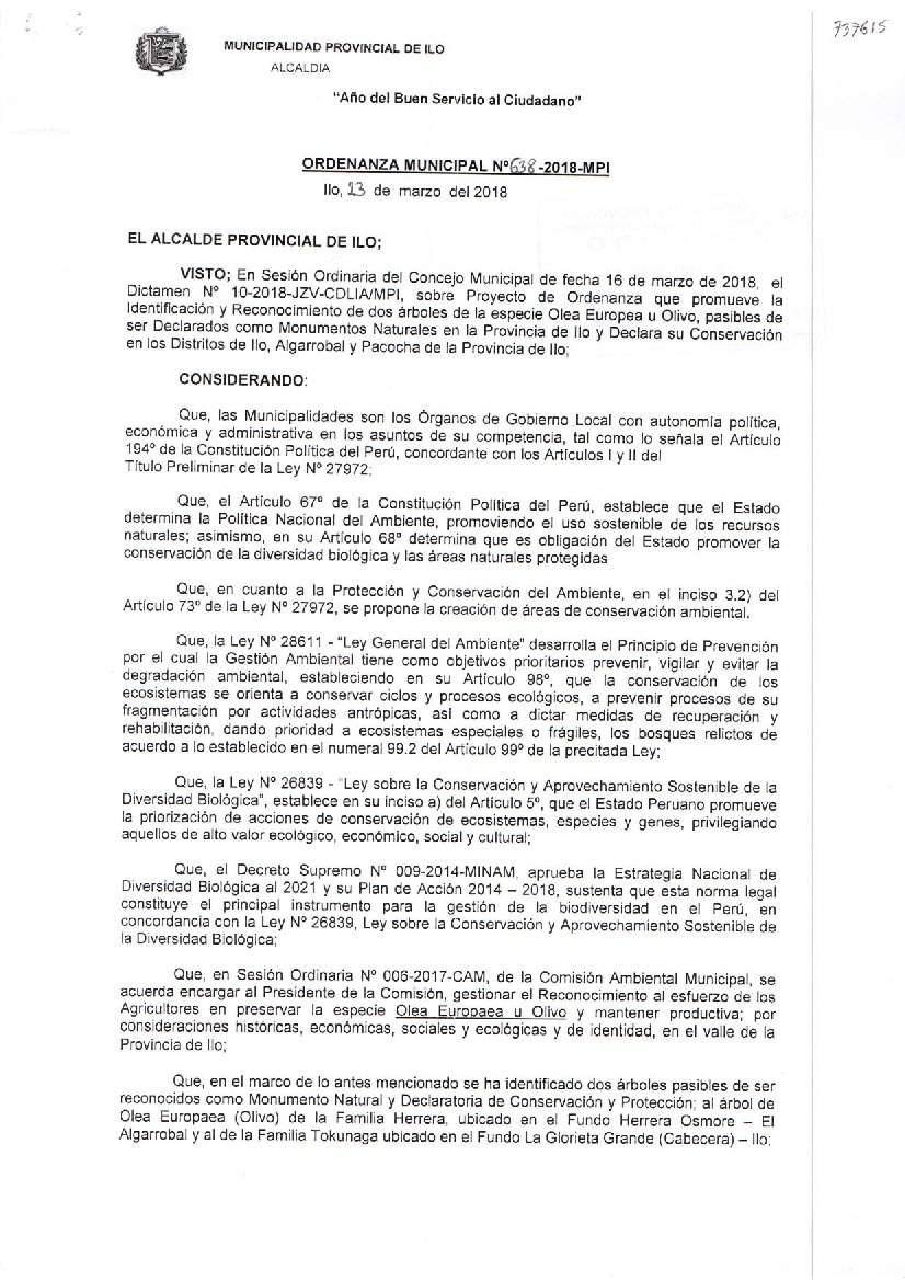 Ordenanza Municipal que promueve la identificación y reconocimiento de especies pasibles de ser declarados como monumentos naturales en la provincia de Ilo y declara de interés provincial la conservación y protección de Olivos en Ilo