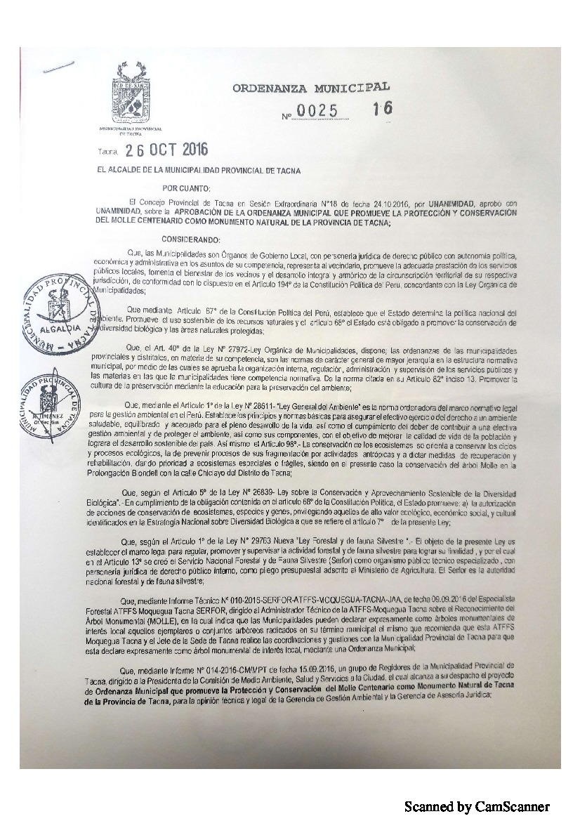 Ordenanza Municipal que promueve la protección y conservación del árbol de Molle Centenario como monumento natural de la provincia de Tacna
