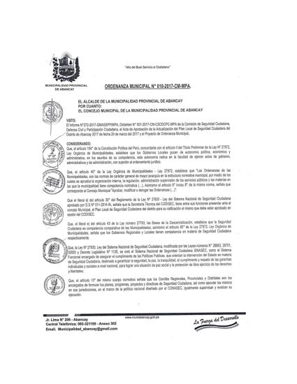 ORDENANZA MUNICIPAL QUE RATIFICA LA ACTUALIZACIÓN DEL PLAN LOCAL DE SEGURIDAD CIUDADANA DEL DISTRITO DE ABANCAY 2017
