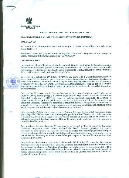 Ordenanza Municipal que Ratifica El Plan Local y El Plan Provincial de Seguridad Ciudadana - Trujillo