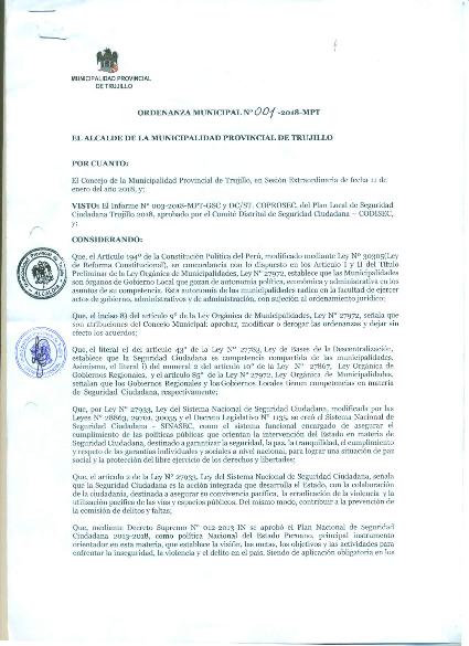 Ordenanza Municipal que Ratifica el Plan Local de Seguridad Ciudadana Trujillo 2018, Aprobado por el Comité Distrital de Seguridad Ciudadana - COPROSEC - CODISEC