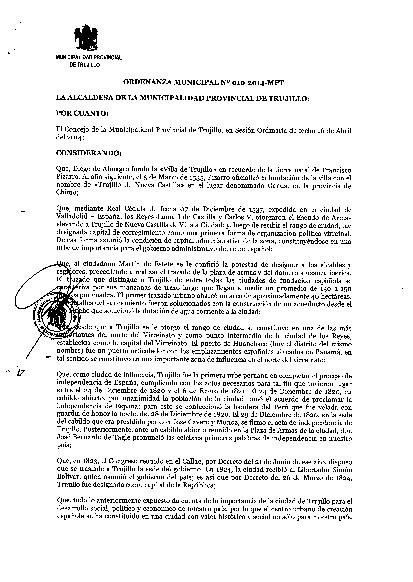 Ordenanza Municipal que reconoce al Centro Histórico de Trujillo y sus Áreas de Protección y Tratamiento especial como Área de Uso Urbano.