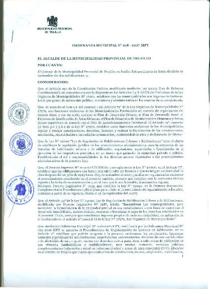 Se aprueba el Procedimiento de Regularización de Licencia de Edificaciones del Distrito de Trujillo, a fin de formalizar obras de edificaciones existentes de uso viviendas (unifamiliares y multifamiliares), usos mixtos, comercio, servicios públicos complementarios (educación y salud en todos sus niveles) y zonas de usos especiales (O.U); de obras culminadas, ampliación, remodelación, modificación y demolición realizadas sin licencia, siempre que cumplan con las normas vigentes señaladas en la Ley N° 29090, D.L. 1225, D.L. 1287, Ley No 30494, Decreto Supremo N° 011-2017-VIVIENDA, las disposiciones del Reglamento Nacional de Edificaciones y con las condiciones, requisitos y tolerancias establecidos en la presente ordenanza.