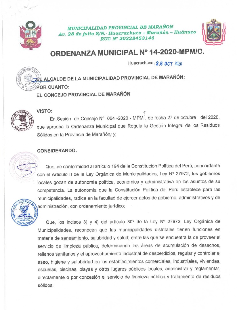 Ordenanza Municipal que regula la gestión integral de los residuos sólidos de la Municipalidad Provincial de Marañón