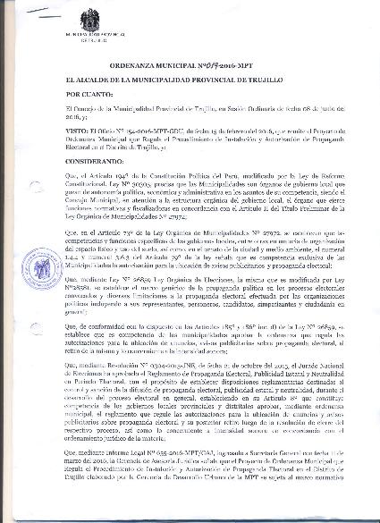 Ordenanza Municipal que regula El Procedimiento de Instalación y Autorización de Propaganda Electoral en el Distrito de Trujillo, el cual consta de 3 capítulos, 16 Artículos y 5 disposiciones transitorias y finales.