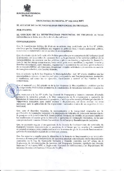 Ordenanza Municipal que regula la ubicación y la obtención de Licencia de Funcionamiento de Terminales de Transporte Terrestre Regular de personas en la ciudad de Trujillo