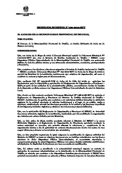Ordenanza que adecúa y modifica el Estatuto y la Ley de Creación del Servicio de Gestión Ambiental de Trujillo aprobados mediante las Ordenanzas Municipales Nº 012-2007–MPT y 013-2007–MPT.
