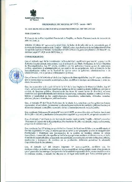 Ordenanza que aprueba la actualización del Plan Integral de Gestión Ambiental de Residuos Sólidos de la provincia - PIGARS 2016-2020 para la provincia de Trujillo