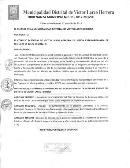 Ordenanza que aprueba la actualización del Plan de Manejo de Residuos Sólidos de la Municipalidad Distrital de Víctor Larco Herrera