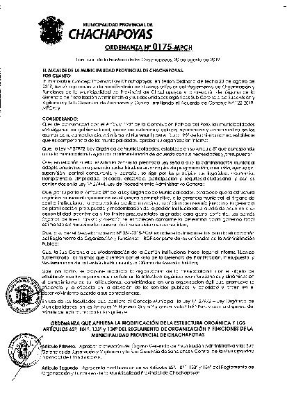ORDENANZA QUE APRUEBA I.A MODIfICACIóT'¡ OE N CSTNUCTUNE ORGÁNICA Y I.OS aRrfculos ó2., tol ", 133" y r 34" DEr REGIAMENTO DE ORGANIZACIóN Y FUNCIONES DE tA MUNICIPATIDAD PROVINCIAT DE CHACHAPOYAS