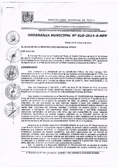 Ordenanza que aprueba la incorporación y modificación de funciones en materia de certificación ambiental en el Reglamento de Organización y Funciones de la Municipalidad Provincial