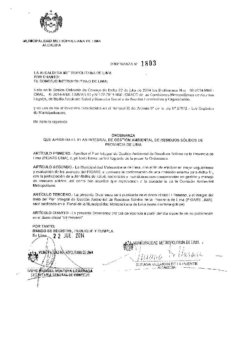 Ordenanza que aprueba el Plan Integral de Gestión Ambiental de Residuos Sólidos de la Provincia de Lima